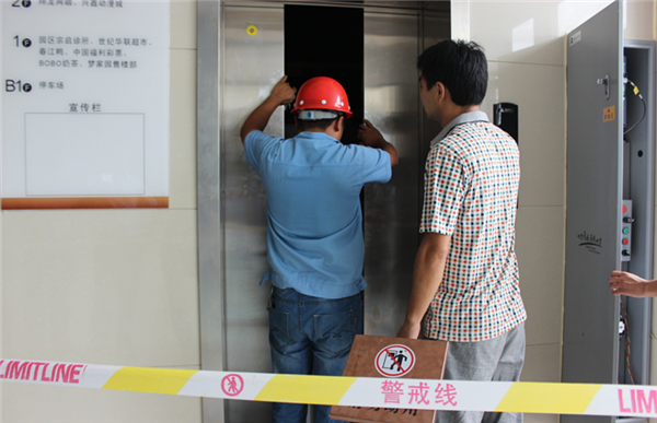 本次演練模擬在西楚金地突發(fā)的一起電梯故障困人事件而展開的應(yīng)急救援。上午9時(shí)30分,兩名乘客乘坐西楚金地1號電梯升至4層時(shí)突然遭遇電梯停電,乘客緊急按動報(bào)警按鈕,語音向中控室反映電梯突然停梯,梯內(nèi)被困乘客兩名。中控室接到報(bào)警后,立即啟動電梯故障困人應(yīng)急救援預(yù)案,在安撫乘客的同時(shí),迅速通知工程維修中心及維保單位。相關(guān)人員迅速兵分兩路,一路到電梯機(jī)房準(zhǔn)備盤車,平層施救;另一路到救援樓層4層準(zhǔn)備手動打開廳門,營救轎廂內(nèi)被困乘客。從接到報(bào)警求助到救援結(jié)束,整個(gè)救援工作不到8分鐘即告成功。