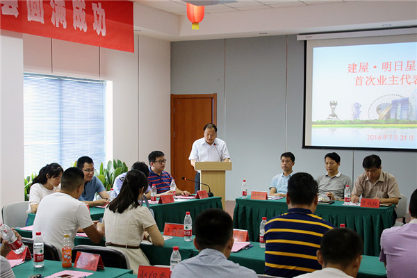 7月31日上午,建屋?明日星城小區(qū)首屆業(yè)主代表大會在明日民眾聯(lián)絡(luò)所召開,園區(qū)第一家小區(qū)業(yè)主代表大會成立和業(yè)主委員會產(chǎn)生。園區(qū)黨工委委員、管委會副主任戈亮出席大會并講話。園區(qū)工委管委會辦公室、勞動保障和社會事業(yè)局、規(guī)劃建設(shè)局等職能部門、園區(qū)部分住宅小區(qū)物業(yè)單位代表列席大會觀摩。